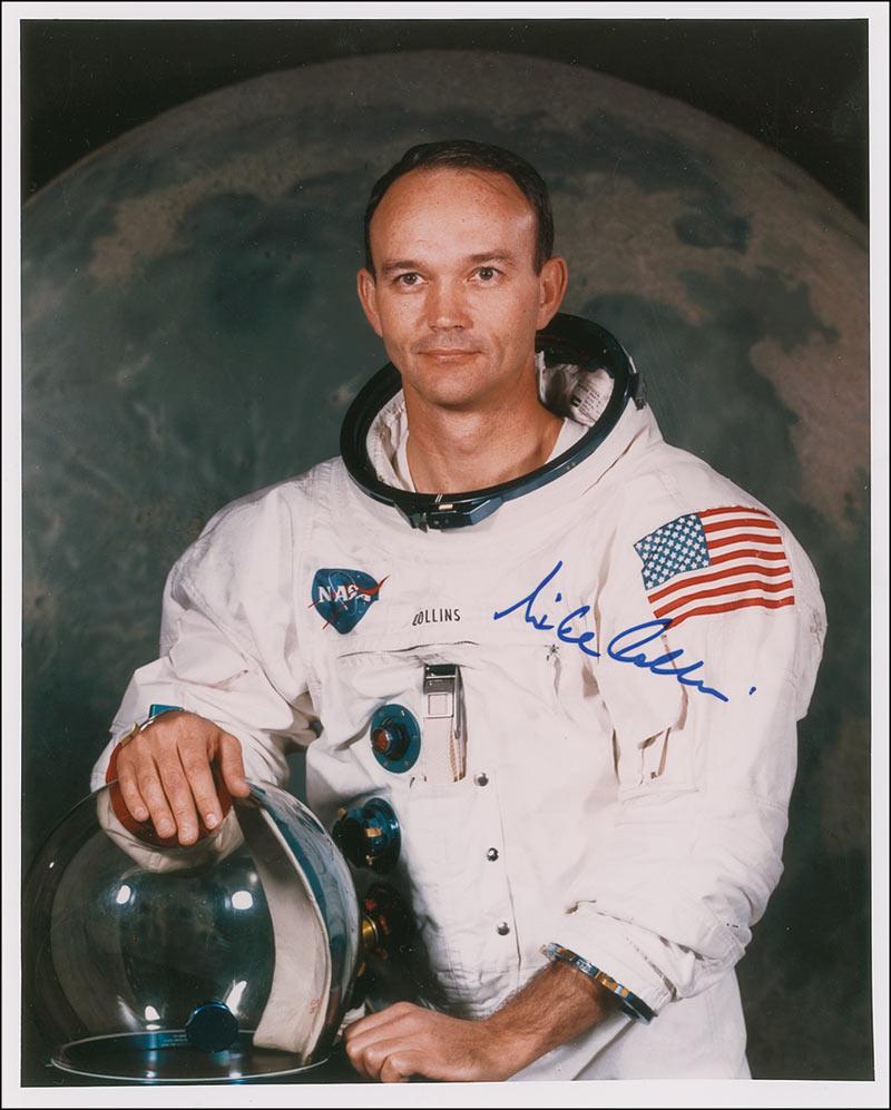 Color satin-finish 8 x 10 photo of Collins posing in his flight suit against a lunar background, signed in blue felt tip. In very fine condition.