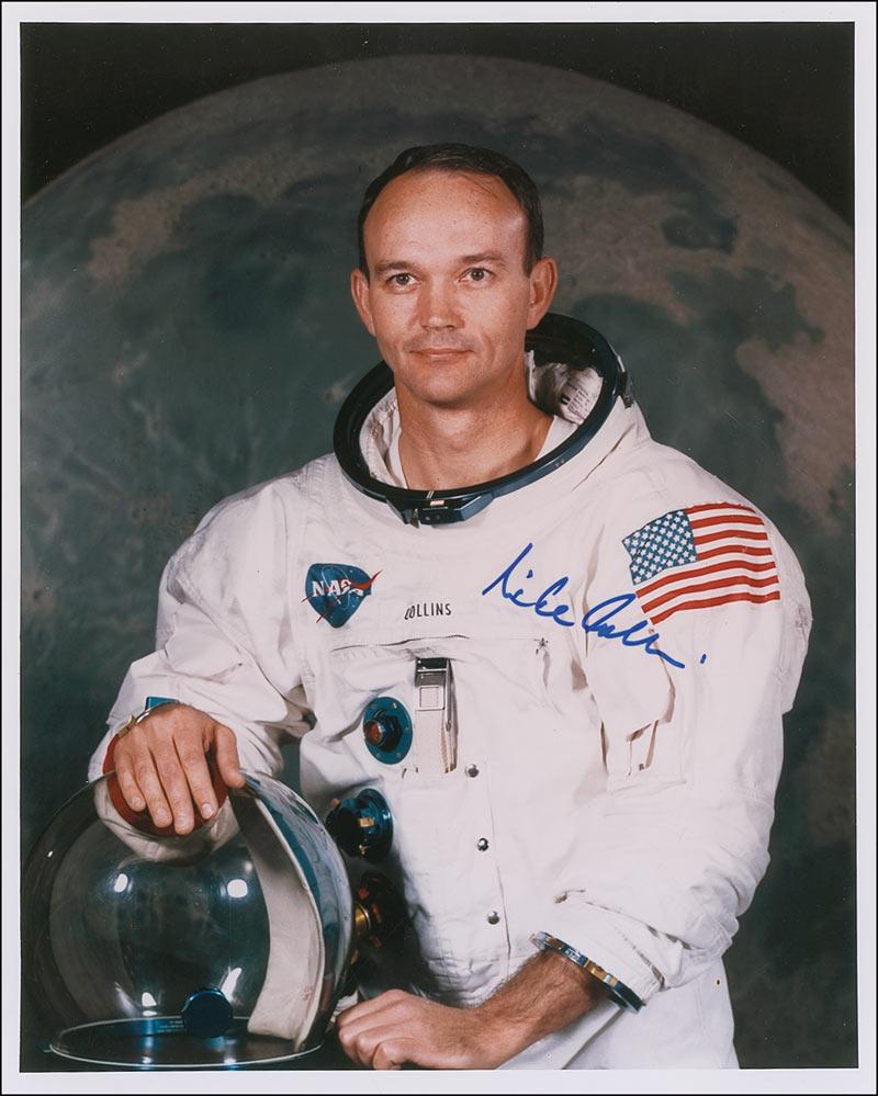 Color satin-finish 8 x 10 photo of Collins posing in his spacesuit against a lunar background, signed in blue felt tip. In very fine condition.