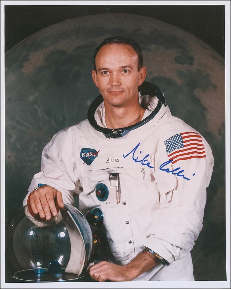 Color satin-finish 8 x 10 photo photo of Collins posing in his flight suit against a lunar background, signed in blue felt tip. In fine condition, with a few very light vertical streaks to the facial area mainly visible at an angle.