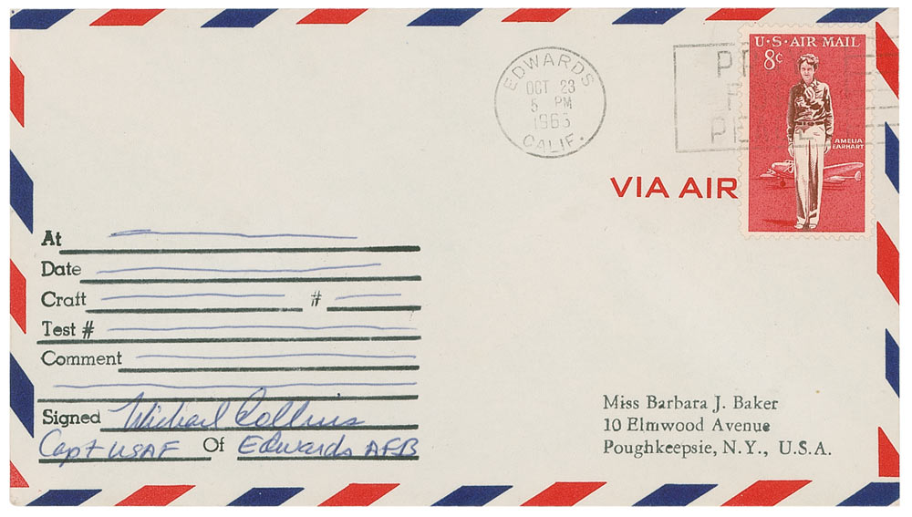Air mail envelope, 6.5 x 3.75, with a set of stamped lines for date, craft, and test number, signed at the bottom in blue ballpoint, “Michael Collins, Capt. USAF, Edwards AFB.” Envelope also bears a printed address to lower right as well as an October 23, 1963, Edwards, California postmark, the same month Collins was selected as part of Astronaut Group 3. In fine condition. Collins’s signing as a pilot with the inclusion of his rank is highly uncommon.