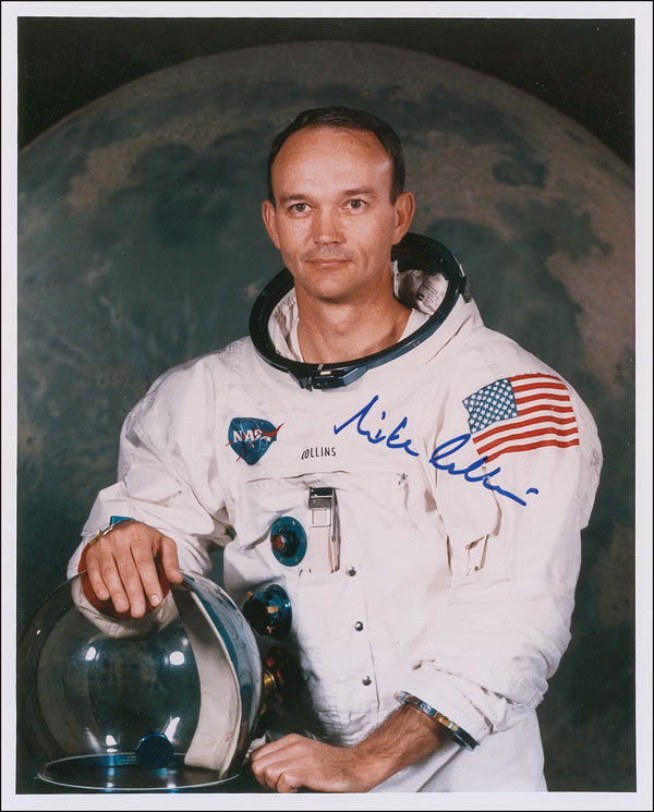 Color satin-finish 8 x 10 photo of Collins in his white spacesuit posing against a lunar background, signed in blue felt tip. In very fine condition.
