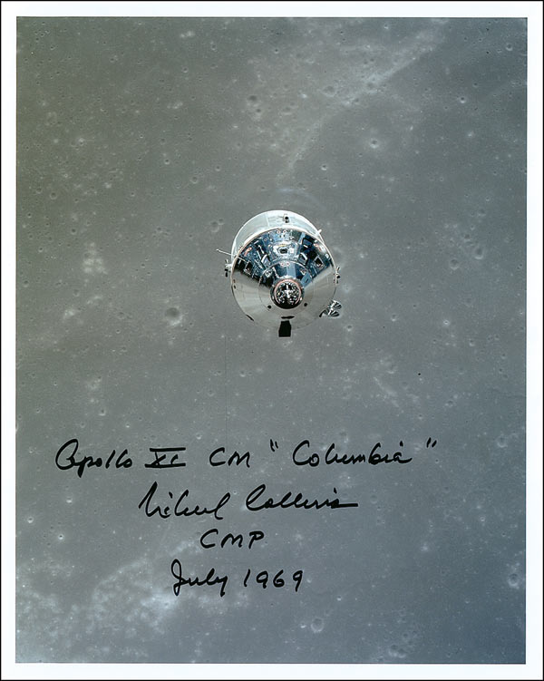 Breathtaking color satin-finish 8 x 10 photo of the Apollo 11 command module orbiting the moon, signed in black felt tip, “Apollo XI CM ‘Columbia’ Michael Collins, CMP, July 1969.” In fine condition, with a couple light creases to lower left corner.