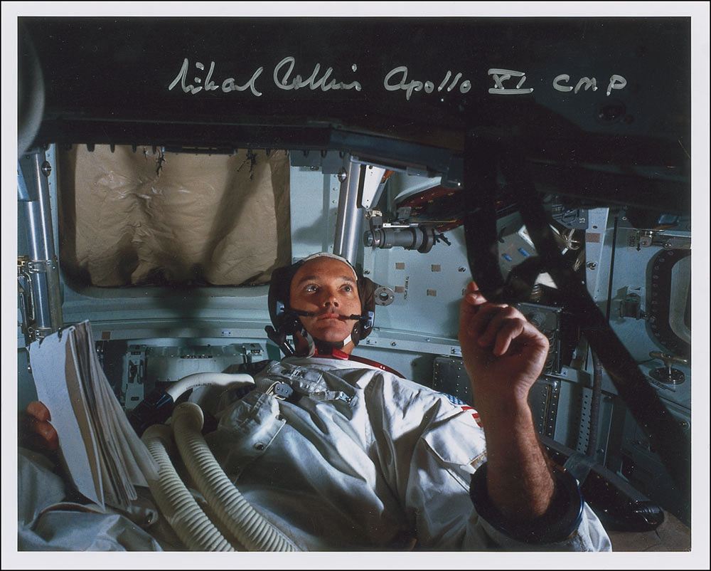 Crystal clear color satin-finish 10 x 8 photo of Collins training in a command module simulator, signed in silver ink, “Michael Collins, Apollo XI CMP.” In very fine condition.