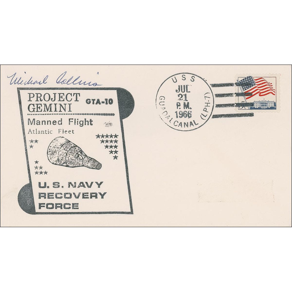 Commemorative cover with a cachet honoring the Gemini 10 naval recovery force, signed above the cachet in blue ballpoint by Collins. In fine condition.