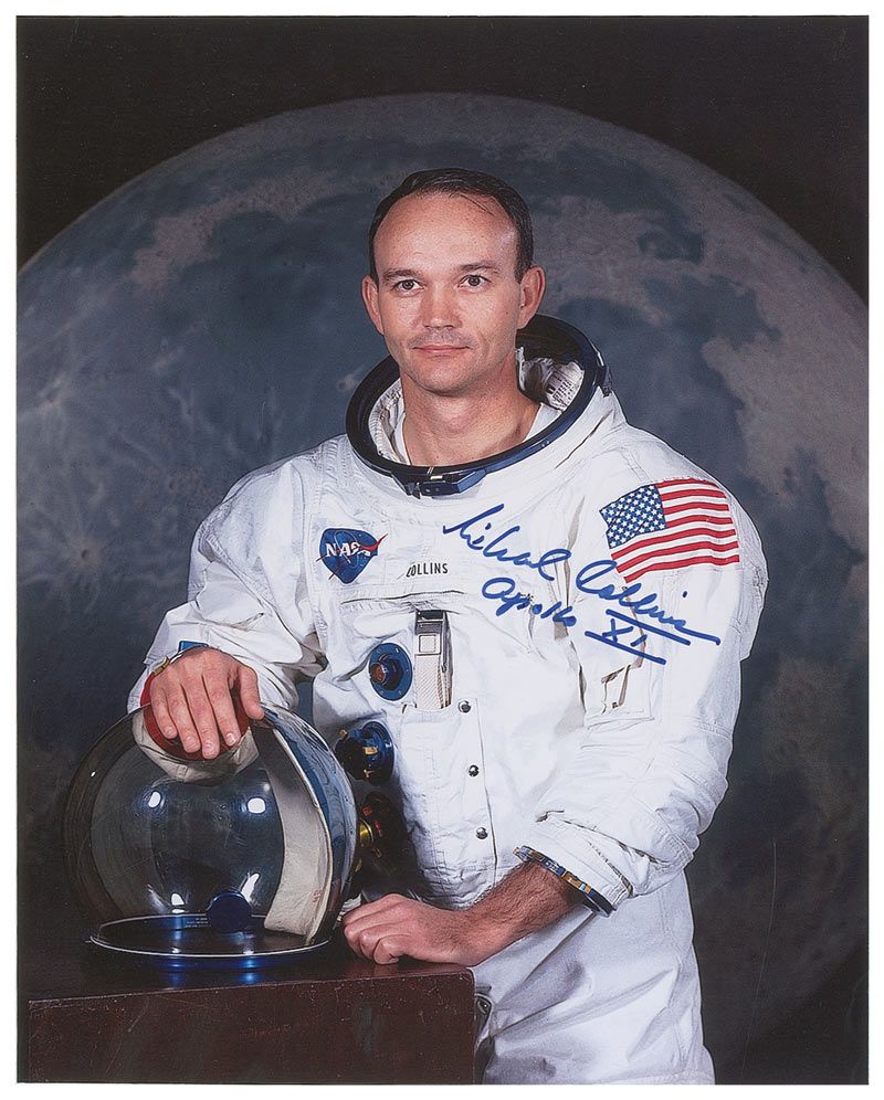 Distinguished color satin-finish 8 x 10 photo of Collins posing in his white spacesuit before a lunar background, signed in blue felt tip, “Michael Collins, Apollo XI.” In fine condition, with a light bend to the top left corner.
