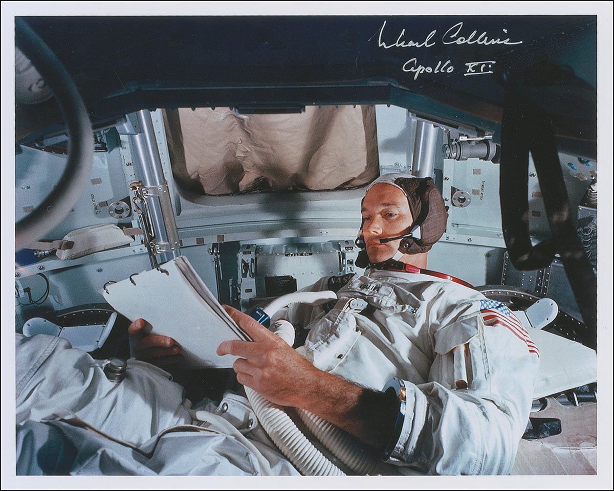Crystal clear color satin-finish 10 x 8 photo of Collins training in a command module simulator, signed in silver ink, “Michael Collins, Apollo XI.” In very fine condition.