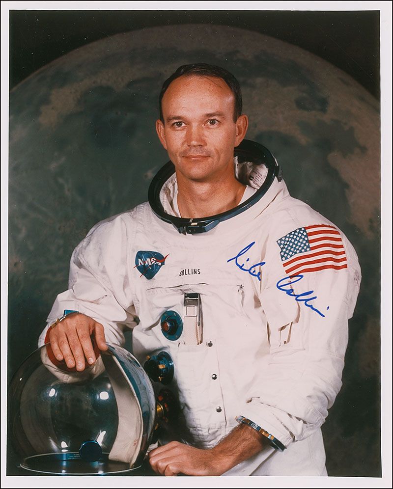 Color satin-finish 8 x 10 photo of Collins in his space suit posing against a lunar background, signed in blue felt tip. In very fine condition.