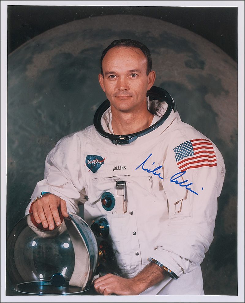 Color satin-finish 8 x 10 photo of Collins in his space suit posing against a lunar background, signed in blue felt tip. In very fine condition.