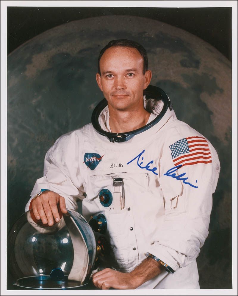 Color satin-finish 8 x 10 photo of Collins posing in his spacesuit against a lunar background, signed in blue felt tip. In fine condition.