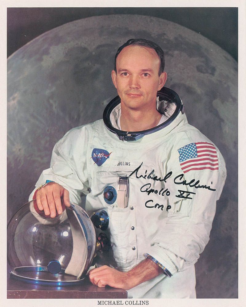 Color 8 x 10 NASA photo of Collins posing in his white spacesuit against a lunar background, signed in black felt tip, “Michael Collins, Apollo XI CMP.” In fine condition.