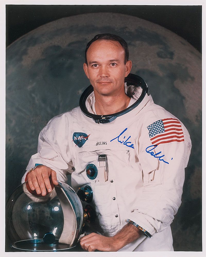 Color satin-finish 8 x 10 photo of Collins posing in his space suit against a lunar background, signed in blue felt tip. In very fine condition.