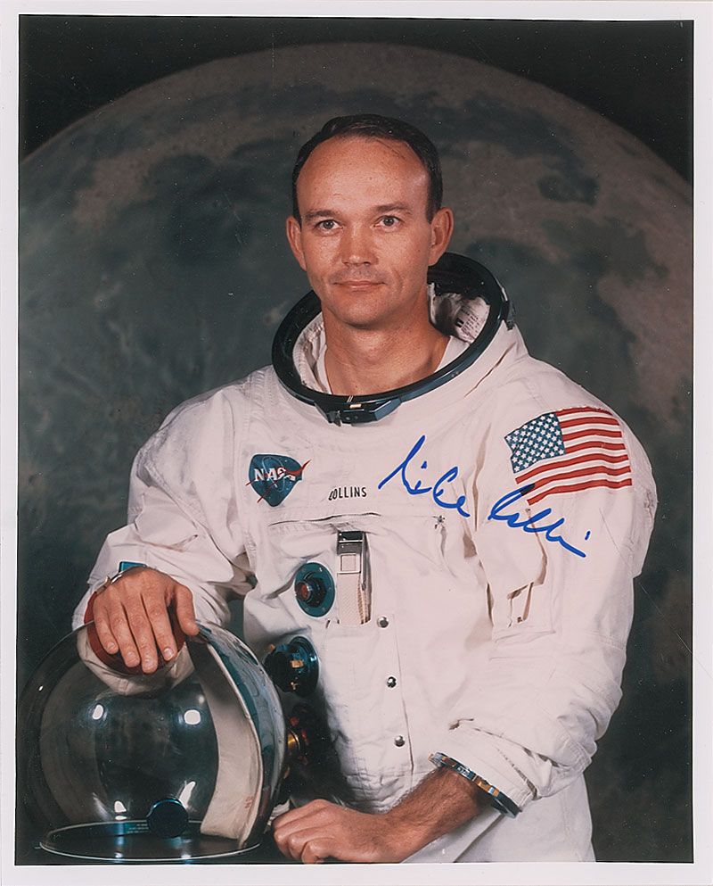 Color satin-finish 8 x 10 photo photo of Collins posing in his flight suit against a lunar background, signed in blue felt tip. In very fine condition.