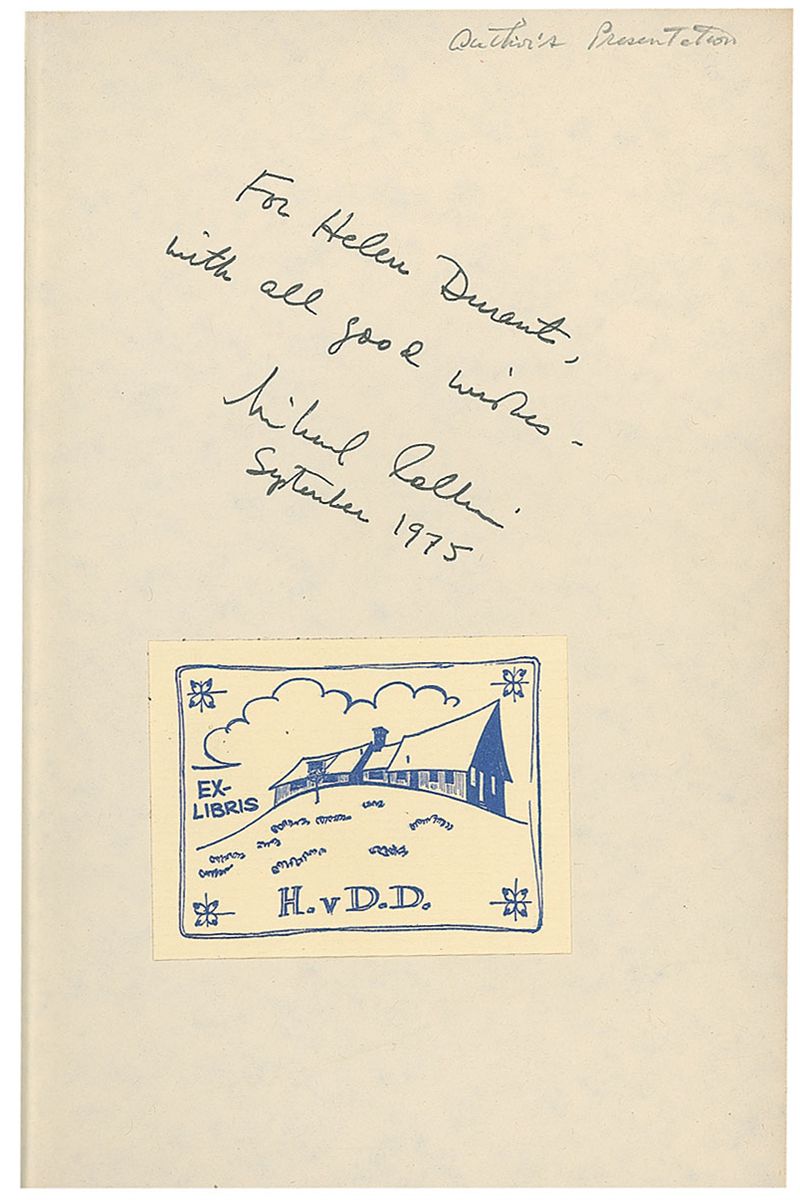Signed book: Carrying the Fire. First edition, later printing. NY: Farrar, Straus and Giroux, 1974. Hardcover with dust jacket, 6.25 x 9.25, 478 pages. Signed and inscribed on the first free end page in black felt tip, “For Helen Durant, with all good wishes—Michael Collins, September 1975.” A few small tears and dings to the dust jacket and an owner’s bookplate affixed to the first free end page below the signature, otherwise fine condition.