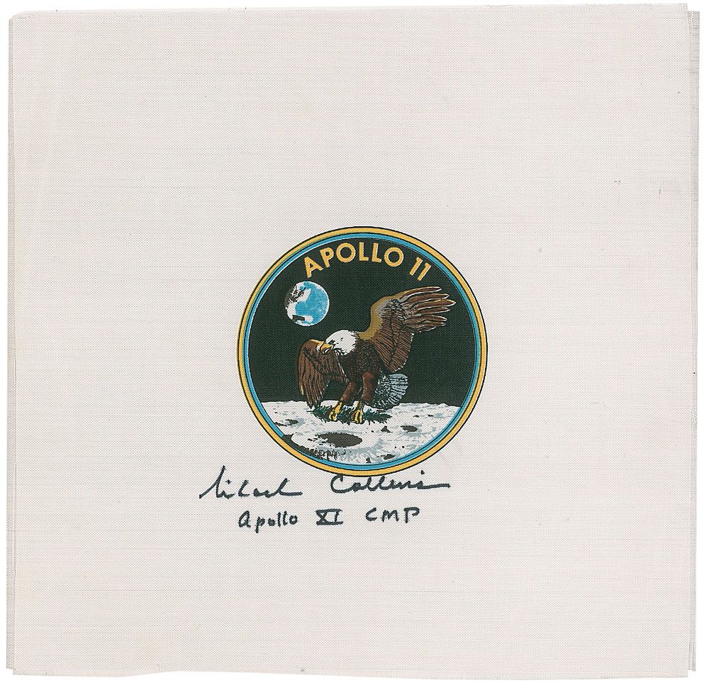 A 9 x 9 swatch of Beta cloth, with a printed 3.25-inch diameter Apollo 11 mission emblem, signed at the bottom in black felt tip, “Michael Collins, Apollo XI CMP.” In fine condition, with a bit of light feathering to signature due to nature of material.