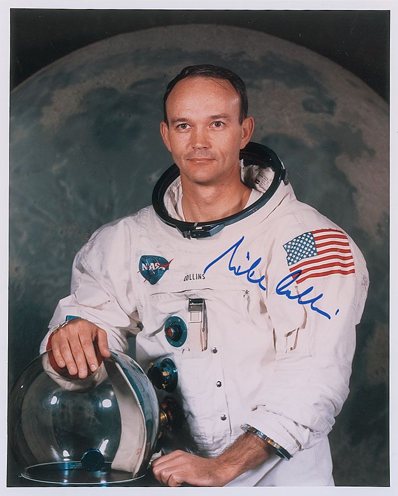 Color satin-finish 8 x 10 photo of Collins in his white space suit, nicely signed in blue felt tip. In very fine condition.
