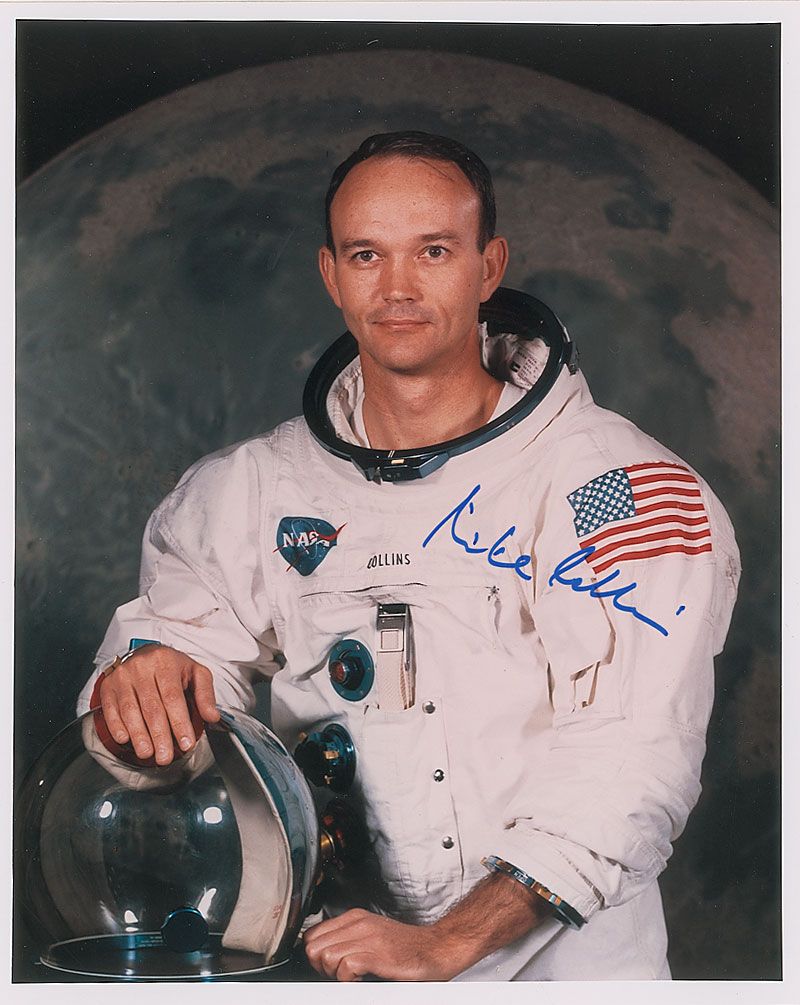 Color satin-finish 8 x 10 photo of Collins posing in his white space suit against a lunar background, signed in blue felt tip. In very fine condition.