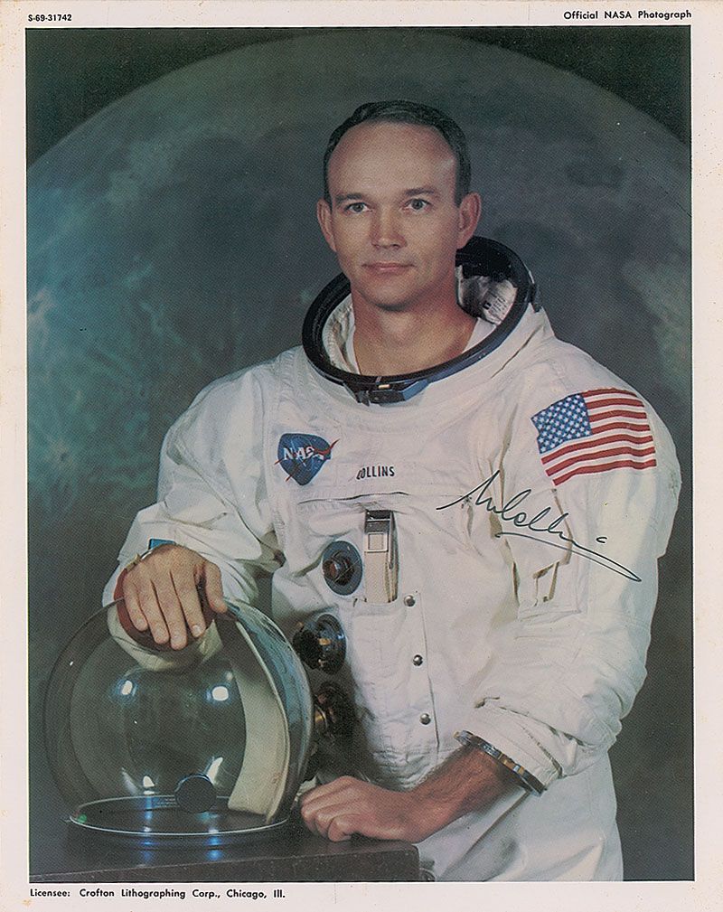 Color 7.25 x 9 NASA photo of Collins in his white space suit posing with his helmet, signed in black felt tip. In fine condition.