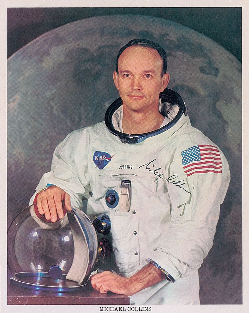 Choice color 8 x 10 NASA photo of Collins posing in his white space suit, signed in black felt tip. In very fine condition.