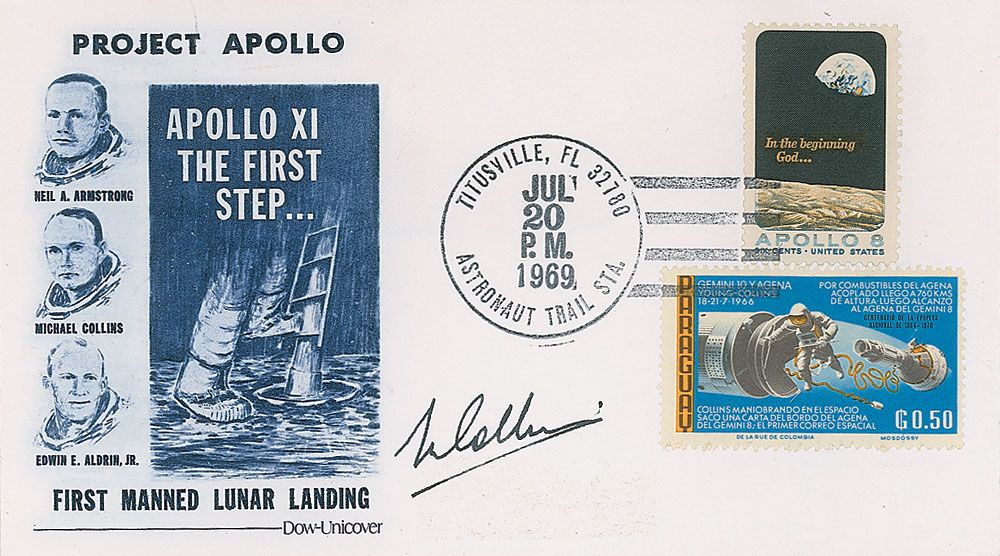 Dow-Unicover commemorative cover with a cachet honoring the Apollo 11 moon landing, signed in black ink by Collins. In fine condition.