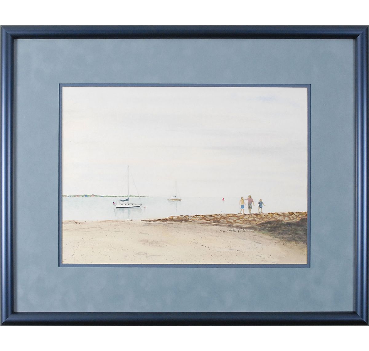 Original hand-painted 14.5 x 10.5 watercolor painting done by Apollo 11 Command Module Pilot Michael Collins, entitled ‘Cape Cod Harbor,’ showing three people on a stone jetty, an empty beach, and two sailboats moored offshore. Signed in black ink, “M. Collins II, 01.” Double-suede-matted and framed to an overall size of 22 x 18. In very fine condition. Accompanied by a certificate of authenticity from Novaspace.