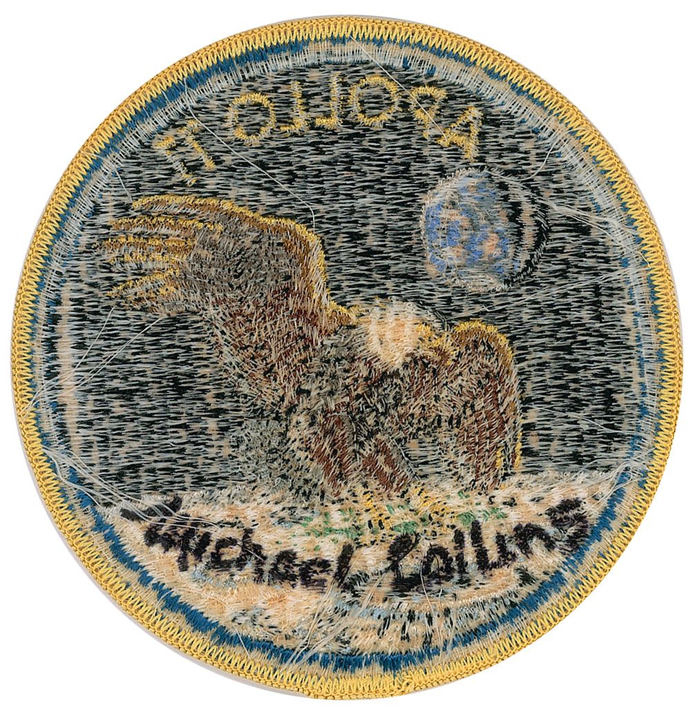 Very rare 4? diameter Apollo 11 Biological Isolation Garment patch featuring the embroidered Apollo 11 mission insignia, signed on the reverse in black felt tip in block letters, “Michael Collins.” This patch design was worn by the crew on their Biological Isolation Garments at recovery time and on their post-flight blue jump suits. In fine condition. Only a small number of these patches were produced and made available only to the crew and NASA employees. Accompanied by a certificate of authenticity from Astronaut Central, stating that the patch comes from Collins’s personal collection.
