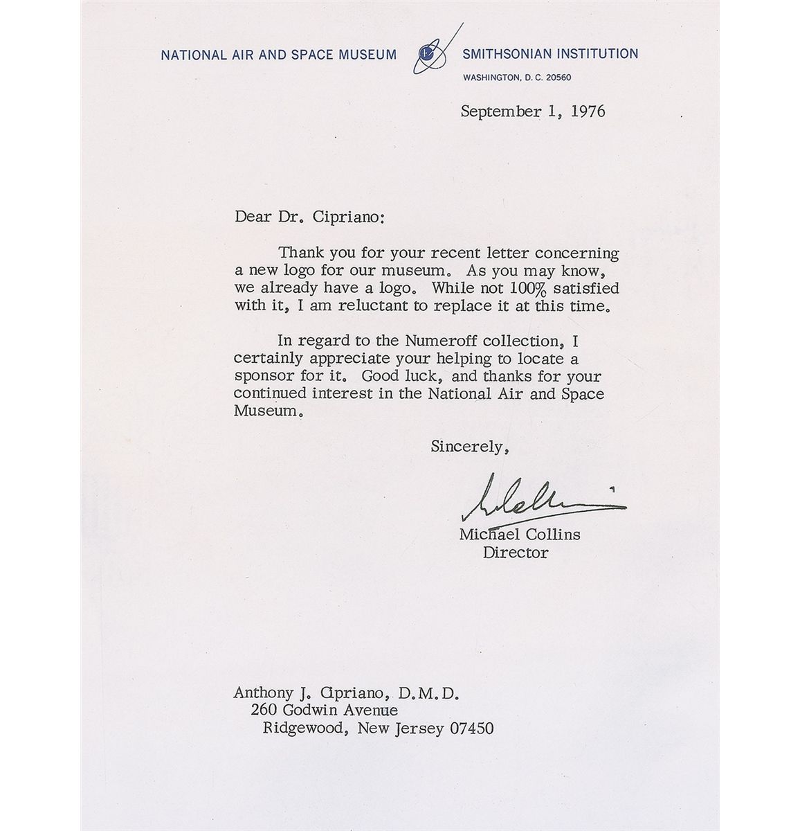 TLS, one page, 7 x 9, National Air and Space Museum letterhead, September 1, 1976. Letter to Dr. Anthony Cipriano. In full: "Thank you for your recent letter concerning a new logo for our museum. As you may know, we already have a logo. While not 100% satisfied with it, I am reluctant to replace it at this time. In regard to the Numeroff collection, I certainly appreciate your helping to locate a sponsor for it. Good luck, and thanks for your continued interest in the National Air and Space Museum.” In fine condition. Accompanied by the original mailing envelope. A political cartoonist for the New York World Telegram and Sun for 25 years, renowned space artist William Joffe Numeroff drew detailed pencil portraits of astronauts and scientists and personally designed cachets for space covers.