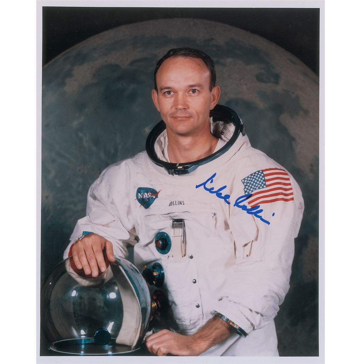 Color satin-finish 8 x 10 photo of Collins in his white space suit against a lunar background, signed in blue felt tip. In very fine condition.