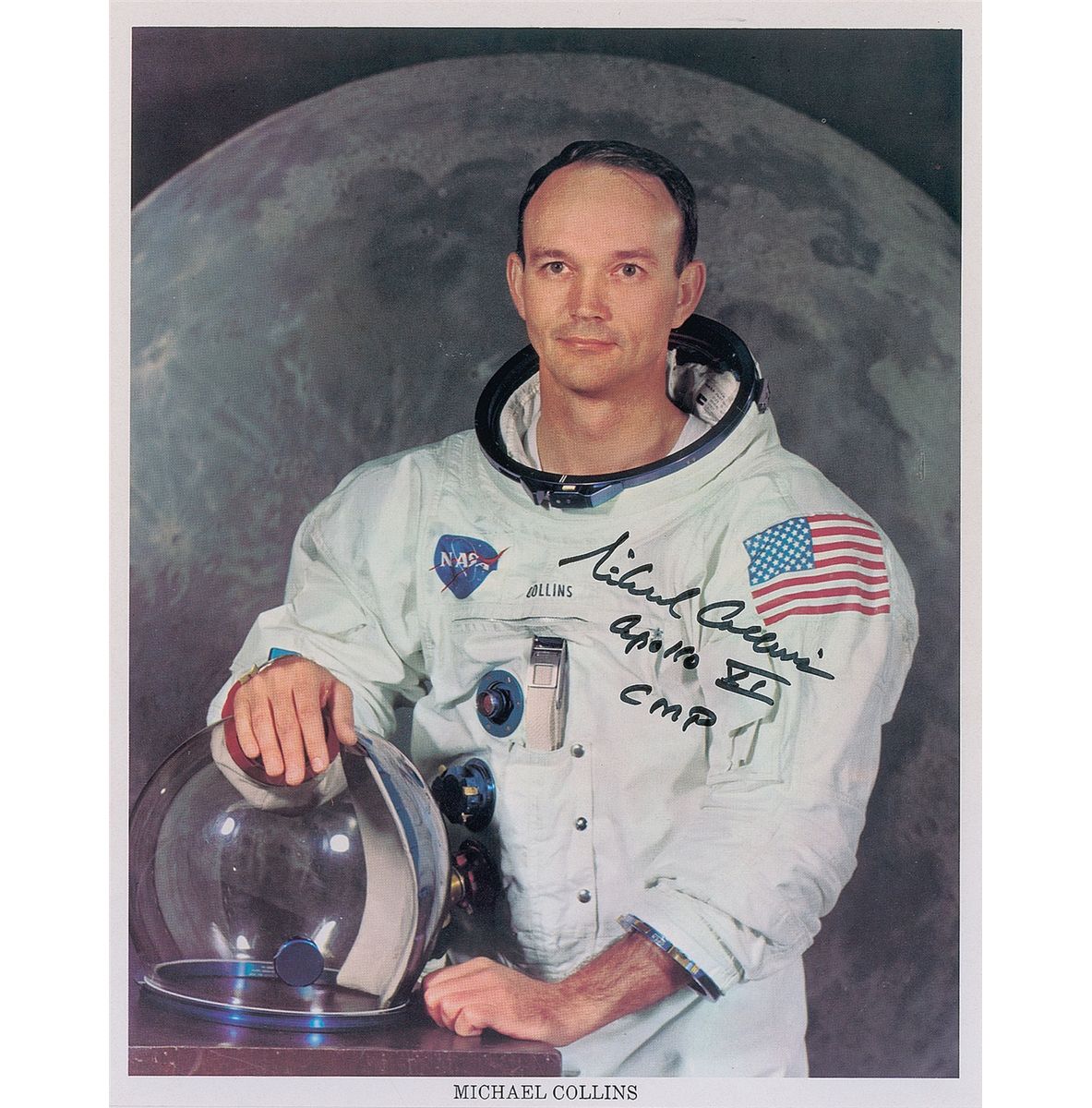 Official color 8 x 10 NASA lithograph of Collins posing in his white space suit against a lunar background, signed in black felt tip, “Michael Collins, Apollo XI CMP.” In very fine condition.