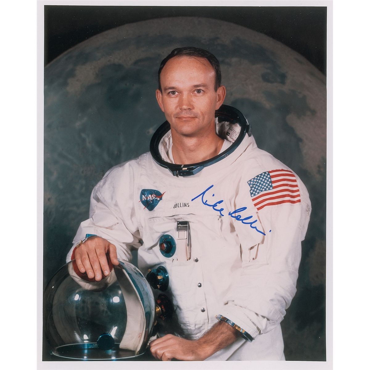 Color satin-finish 8 x 10 photo of Collins posing in his white space suit, signed in blue felt tip. In very fine condition.