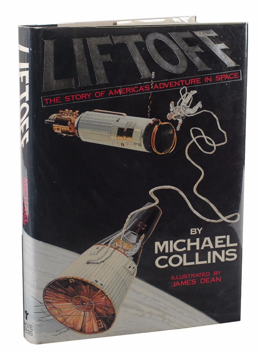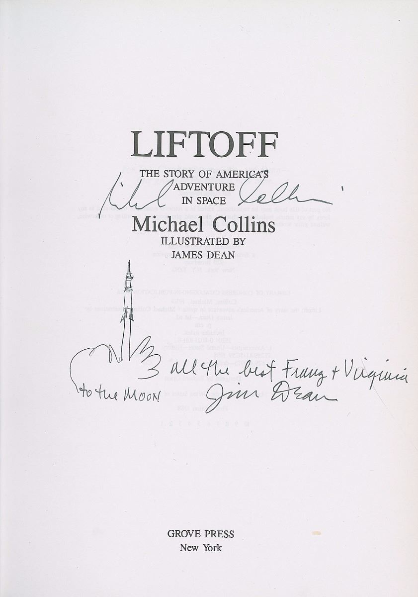 Signed book: Liftoff. First edition, first printing. NY: Grove Press, 1988. Hardcover with dust jacket, 7.25 x 10.25, 288 pages. Signed on the title page in black ink by Collins. Also signed and inscribed on the title page by illustrator James Dean, “All the best Franz & Virginia, Jim Dean,” adding a sketch of a small rocket launch, “to the moon.” In fine condition.