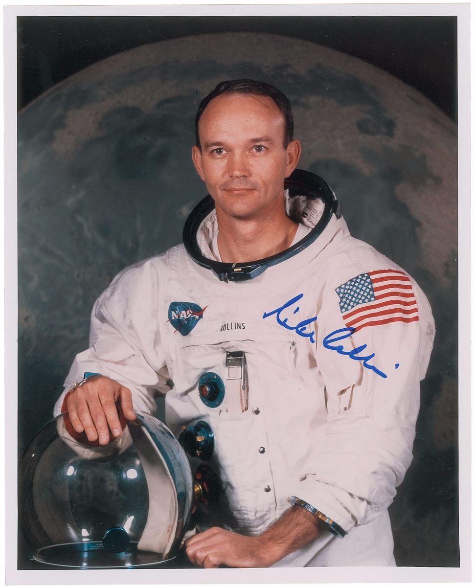 Color satin-finish 8 x 10 photo of the Apollo 11 command module pilot posing in his white space suit, signed in blue felt tip, “Mike Collins.” In fine condition.