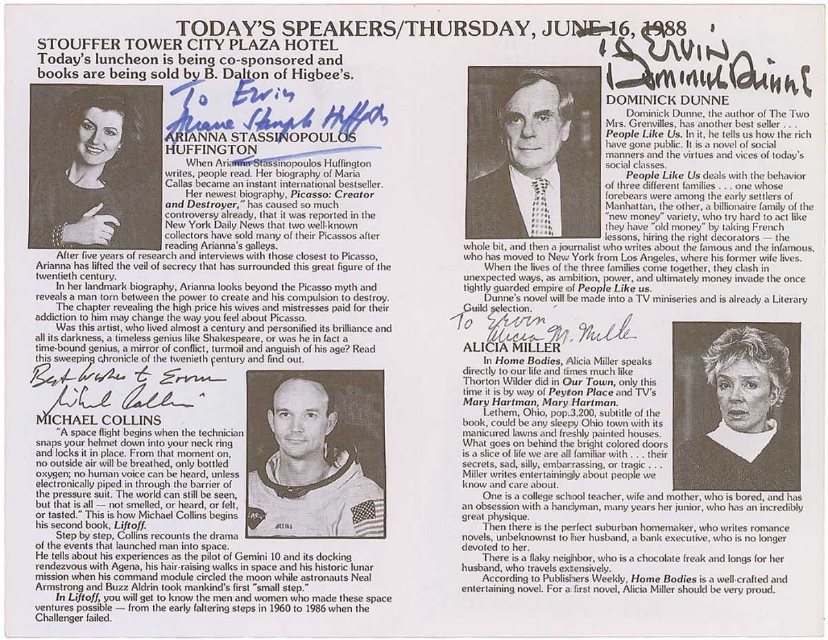 Pamphlet for the The Plain Dealer Book & Author Luncheon in the spring of 1988, measuring 11 x 8.5 open, highlighting the four authors scheduled to speak on June 16 at the Stouffer Tower City Plaza Hotel, signed and inscribed above his description in black ink, “Best Wishes to Ervin, Michael Collins.” Also signed and inscribed by Arianna Stassinopoulos Huffington, Dominick Dunne, and Alicia Miller. In fine condition.