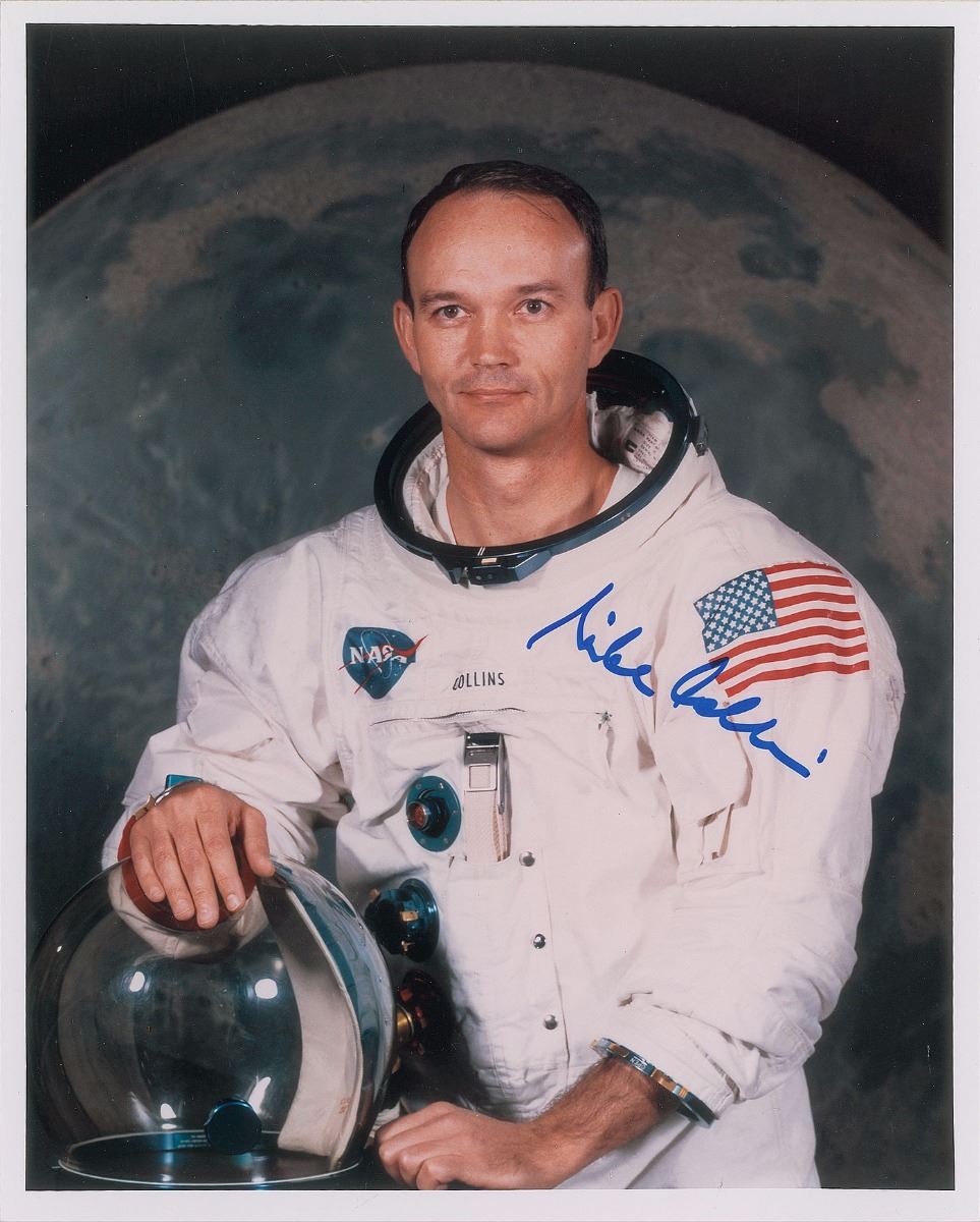 Uninscribed color semi-glossy 8 x 10 photo of the Apollo 11 CMP posing in his white space suit, signed in blue felt tip, “Mike Collins.” In very fine condition.