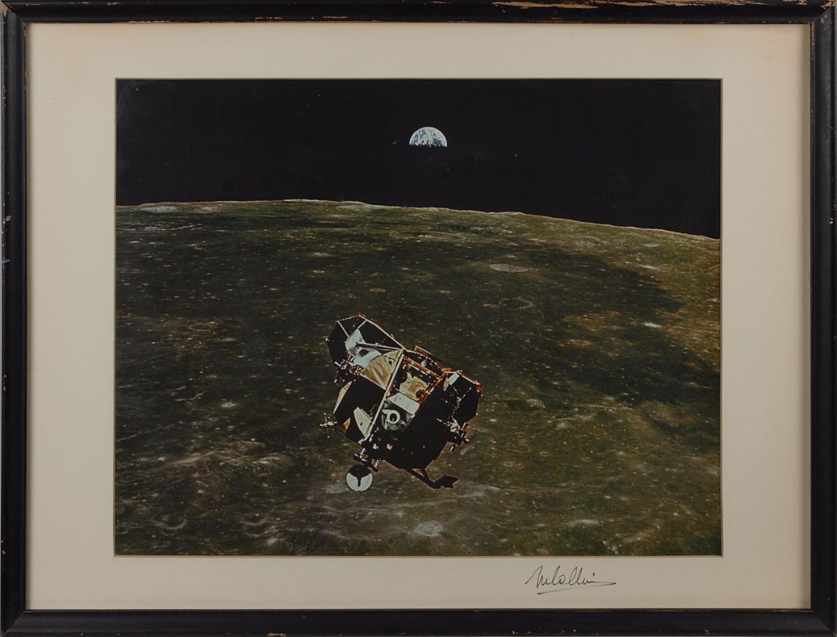 Oversized color semi-glossy 18.25 x 14.5 photo of the Apollo 11 lunar module rising above the moon with a crescent Earth in the distance, signed on the original mat in black felt tip, "M. Collins." Framed to an overall size of 25.25 x 19.25. In fine condition. Pre-certified Zarelli Space Authentication.