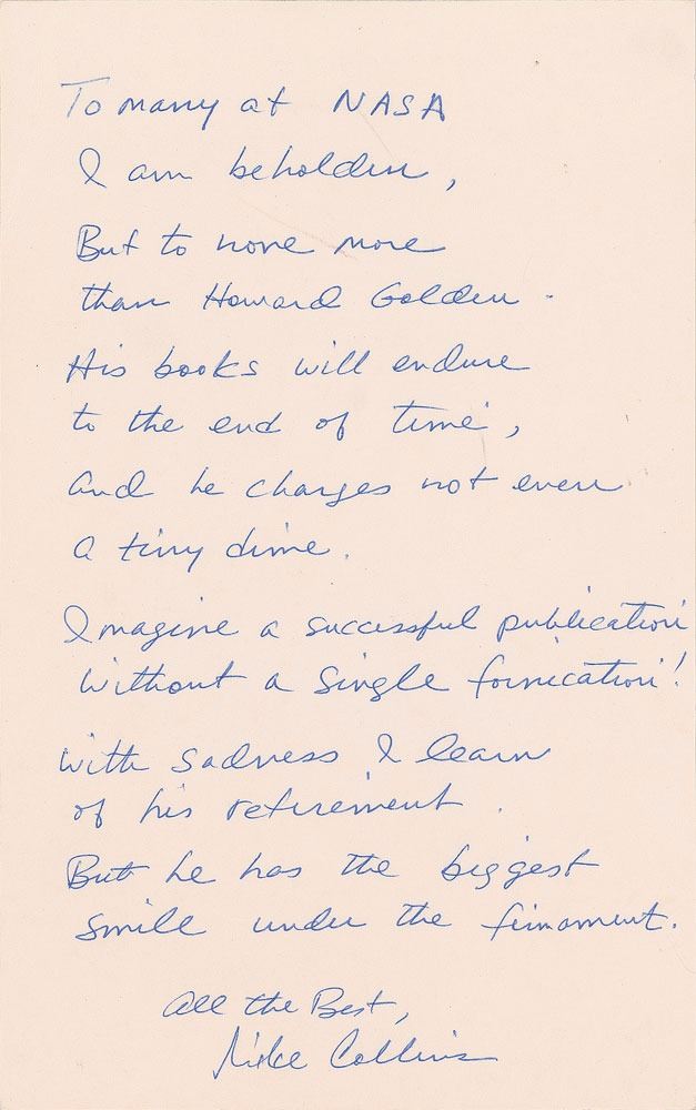 ALS signed “Mike Collins,” one page, 5 x 8, no date. Humorous letter written in the form of a poem, in full: "To many at NASA / I am beholden, / But to none more / than Howard Golden. / His books will endure / to the end of time, / and he changes not even / a tiny dime. / Imagine a successful publication / without a single fornication! / with sadness I learn / of his retirement, / But he has the biggest / smile under the firmament." In fine condition, with a crease to the upper left corner. Accompanied by a business card for the recipient, Howard S. Golden, a federal worker who assisted Vice President Al Gore in The National Performance Review. An amusing letter from the creative mind of the legendary Apollo CMP.