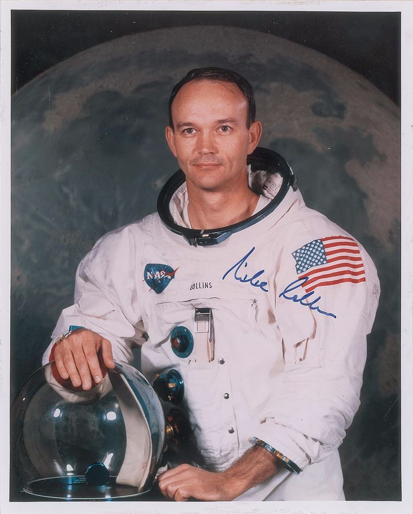 Color semi-glossy 8 x 10 half-length photo of Collins posing in his white space suit against a lunar background, signed in black felt tip, "Mike Collins." In fine condition.