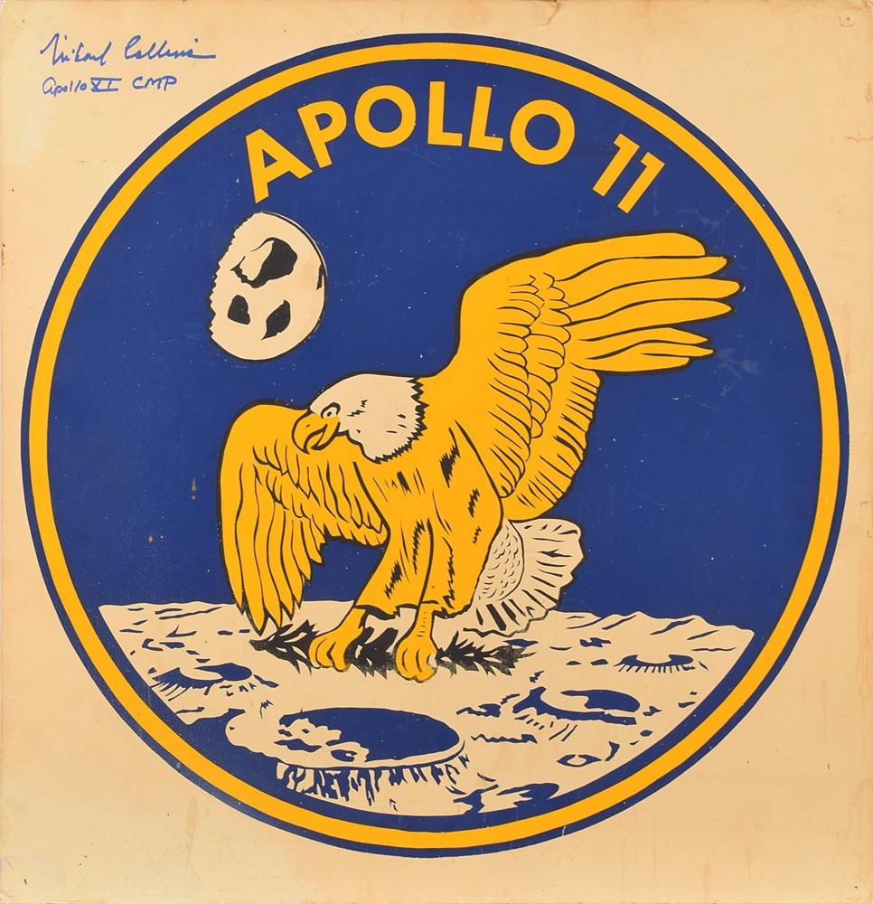 Large cardstock 18.75 x 19.5 sign depicting the Apollo 11 mission insignia, signed in the upper left corner in blue felt tip, "Michael Collins, Apollo 11 CMP." In very good condition, with tack holes to corners, a short tear to the top edge, surface paper loss to the lower left, and scattered light toning and staining. Consignor states that this sign was purportedly removed from the Launch Pad and acquired by a KSC employee.
