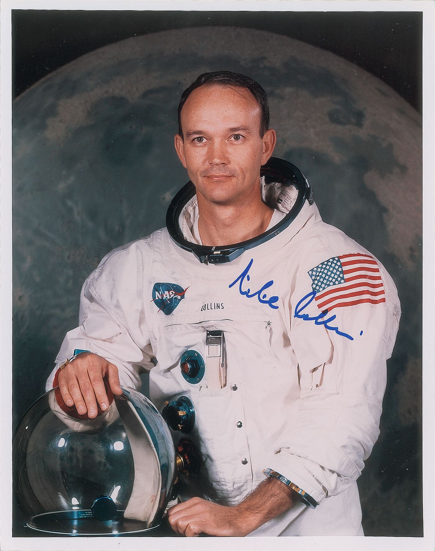 Color semi-glossy 8 x 10 photo of Collins posing in his white space suit against a lunar backdrop, signed in blue felt tip, “Mike Collins.” In very fine condition.