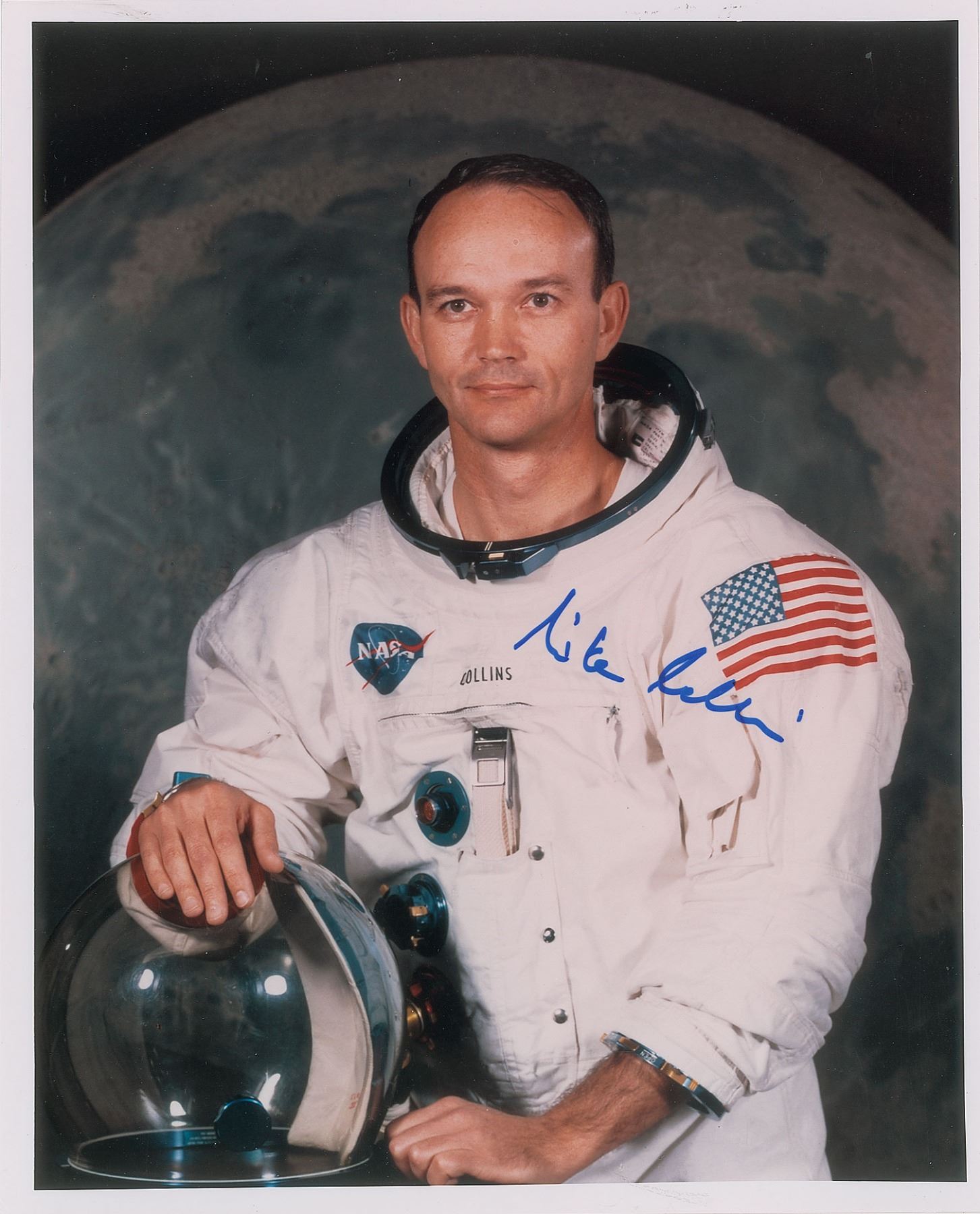 Color semi-glossy 8 x 10 photo of Collins posing in his white space suit against a lunar backdrop, signed in blue felt tip, “Mike Collins.” In very fine condition.