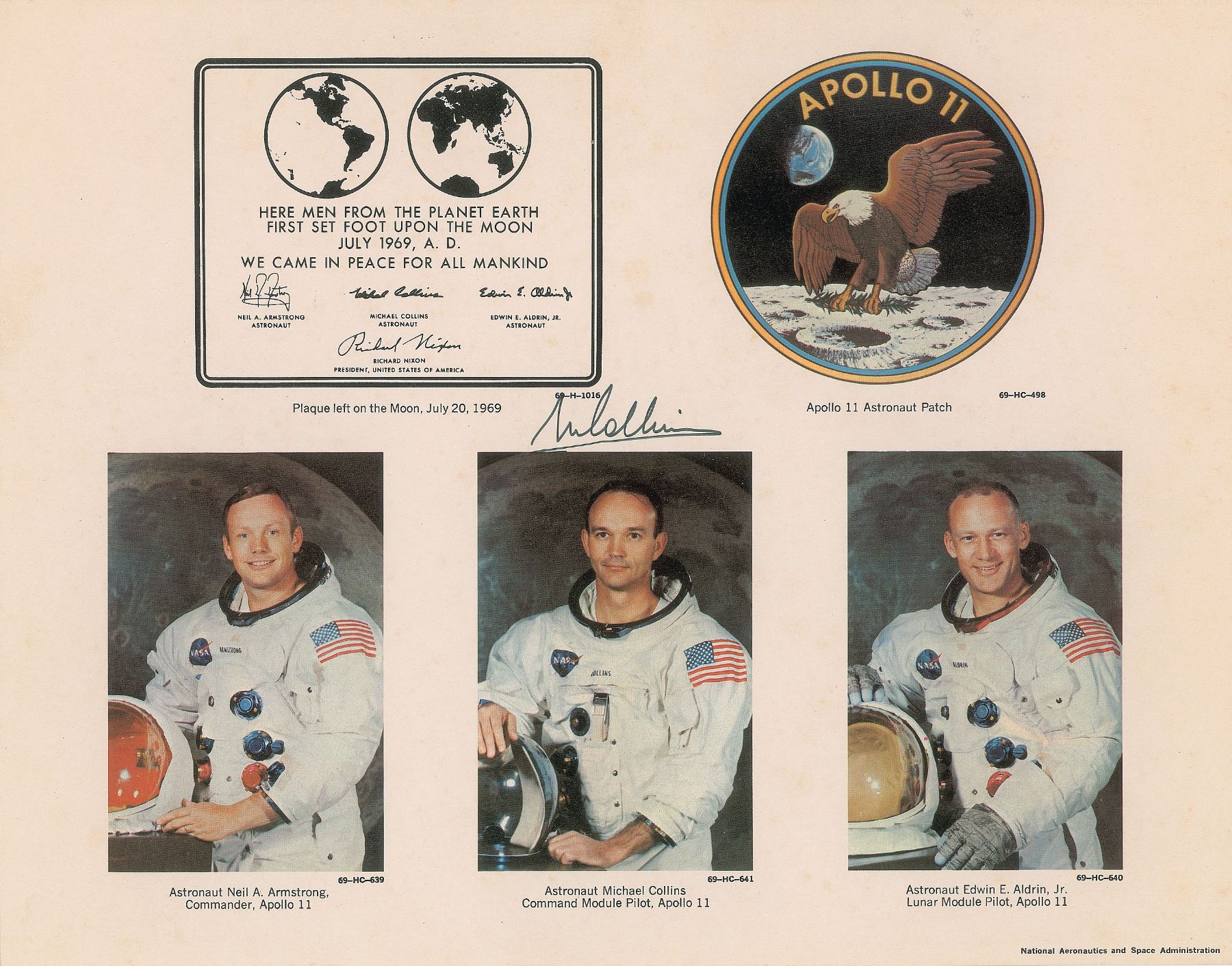Official color 14 x 11 NASA lithograph featuring composite images of the three Apollo 11 astronauts, the mission insignia, and famous lunar plaque, signed in the center in black felt tip, "M. Collins." In fine condition, with scattered faint foxing.