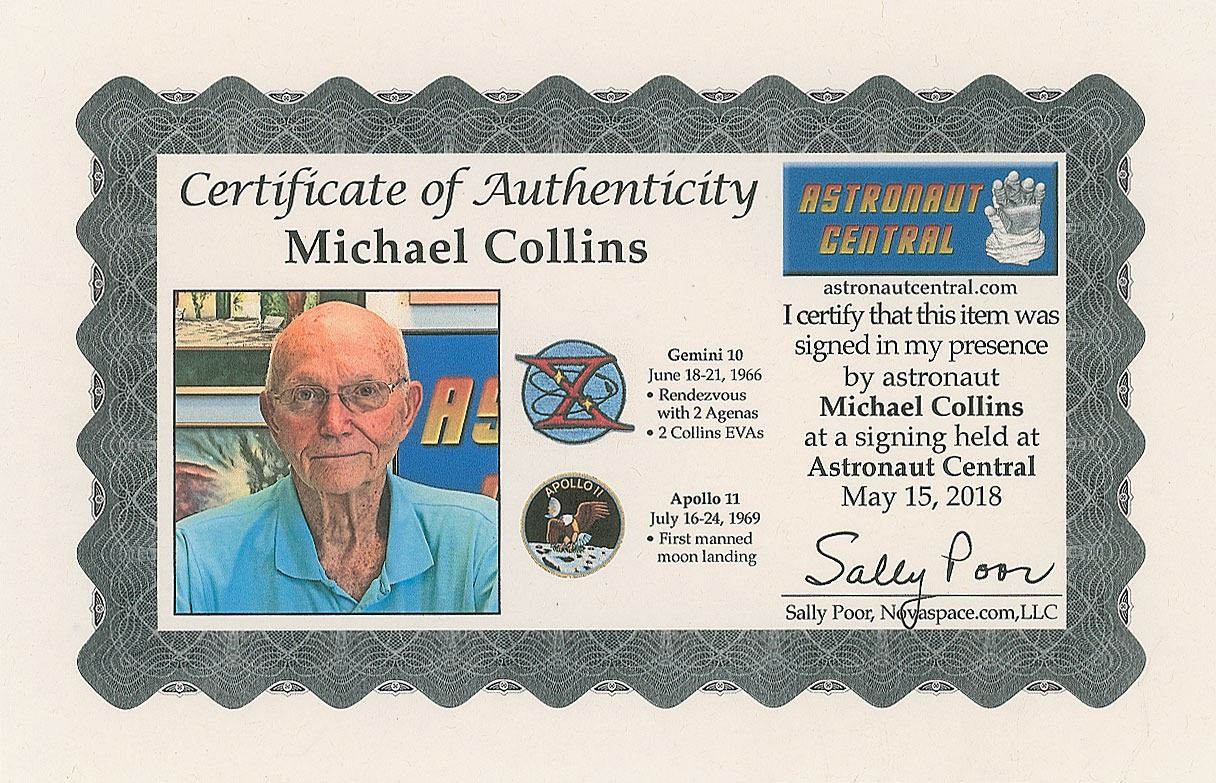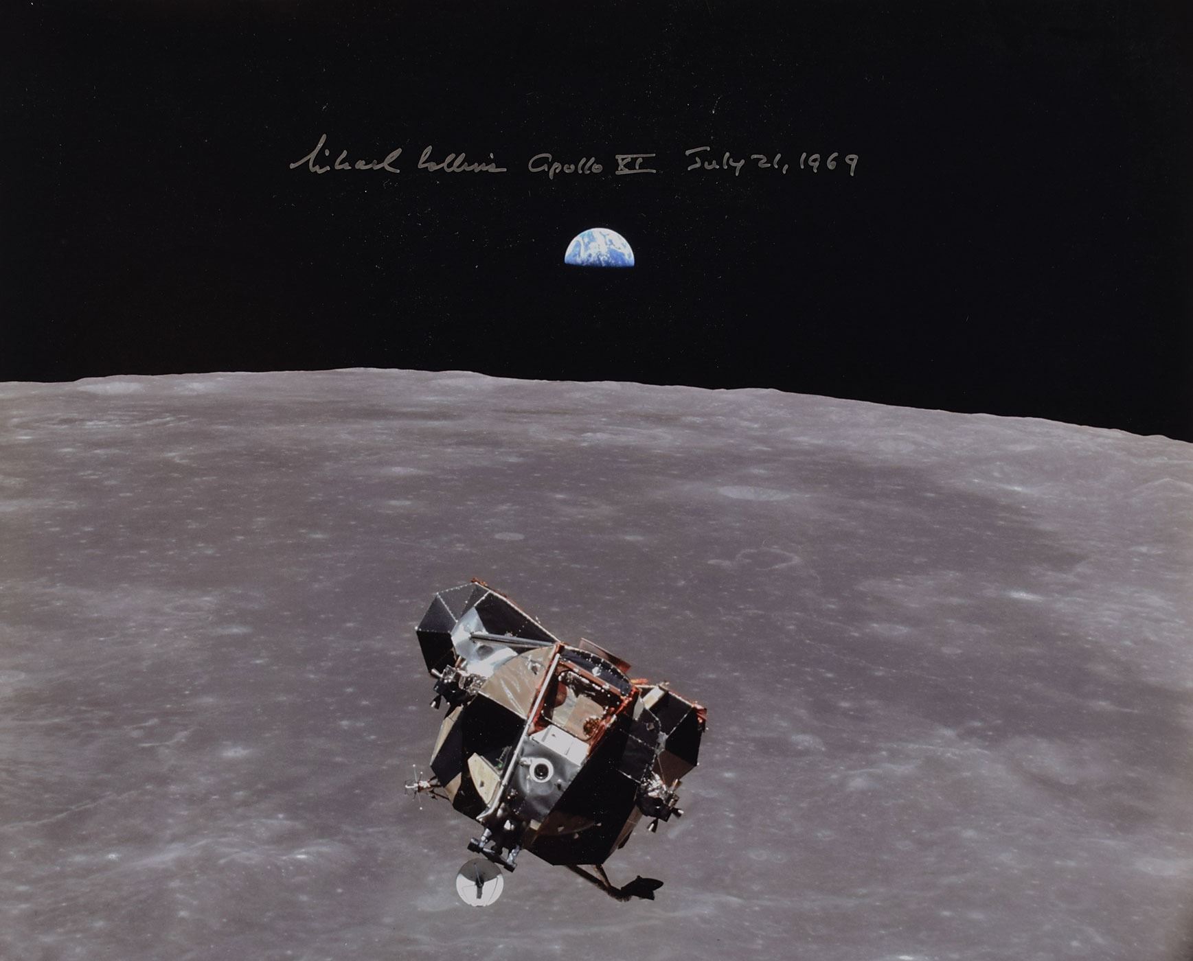 Color satin-finish 20 x 16 photo of the Lunar Module Eagle making its ascent from the moon during the Apollo 11 mission, nicely signed in silver ink, "Michael Collins, Apollo XI, July 21, 1969." In fine condition, with a faint horizontal bend across the top background. Accompanied by a certificate of authenticity from Astronaut Central.