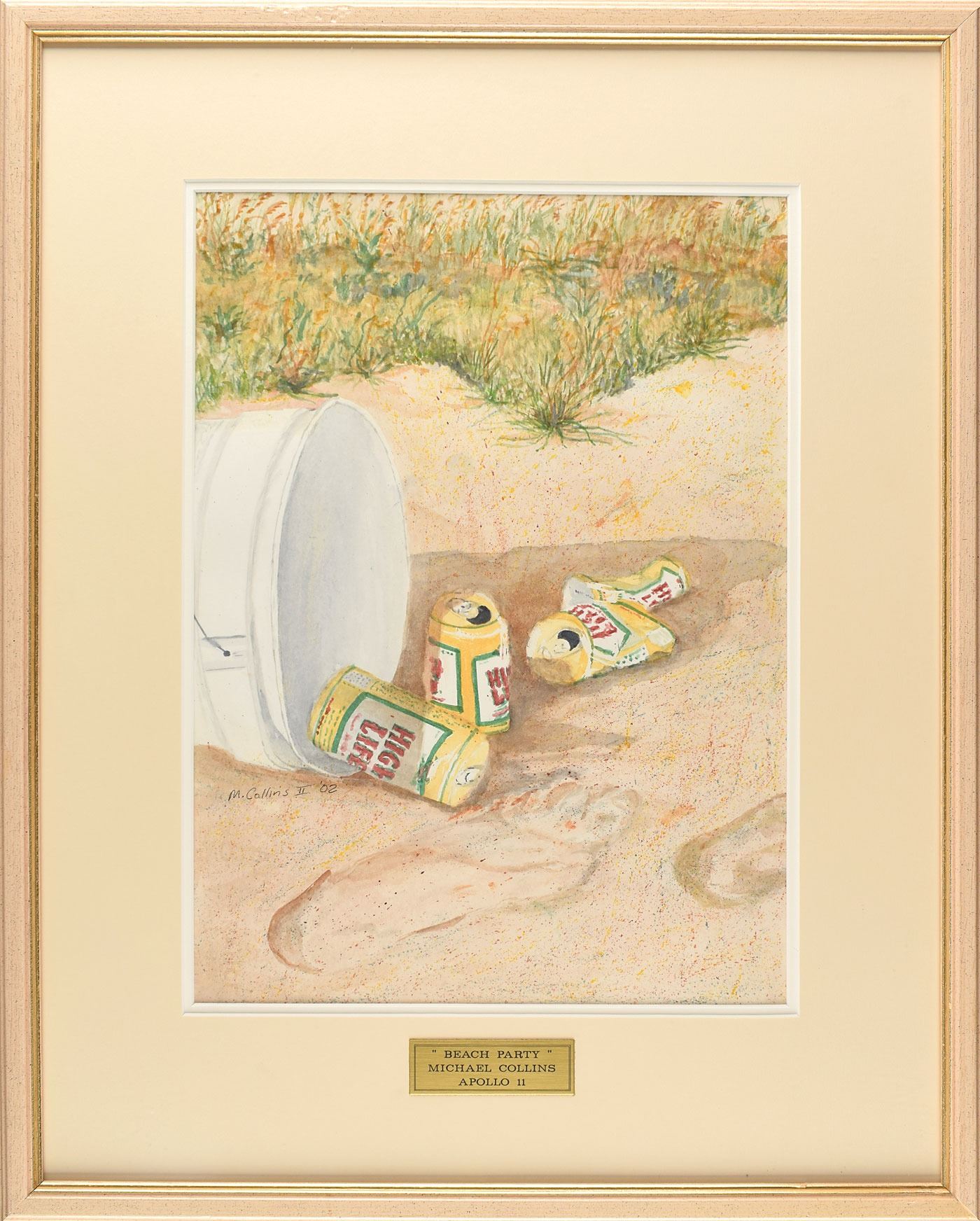 Original watercolor painting by Apollo astronaut Michael Collins entitled 'Beach Party,' 10.75 x 15, which depicts sandy footprints, four cans of beer, and a tipped over bucket, signed in black ink, "M. Collins II '02." Double-matted and framed with a small plaque to an overall size of 18 x 22.5. In fine condition. Accompanied by a certificate of authenticity from Novaspace.