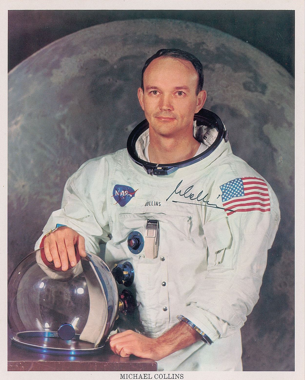 Official color 8 x 10 NASA lithograph of Michael Collins posing in his white space suit against a lunar backdrop, signed in black felt tip, "M. Collins." In fine condition.