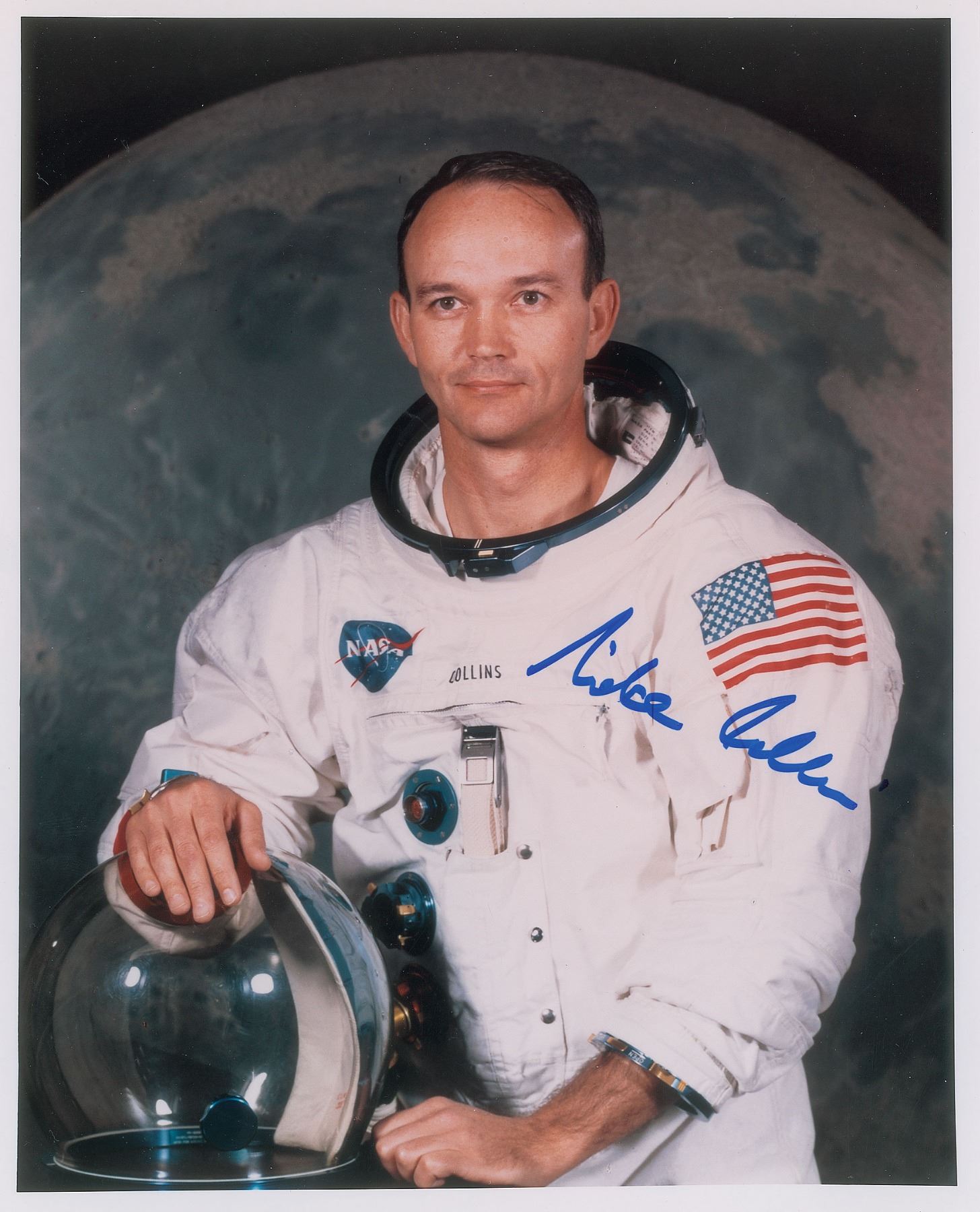 Color semi-glossy 8 x 10 photo of CMP Michael Collins posing in his white space suit against a lunar backdrop, signed in blue felt tip, “Mike Collins.” In very fine condition.