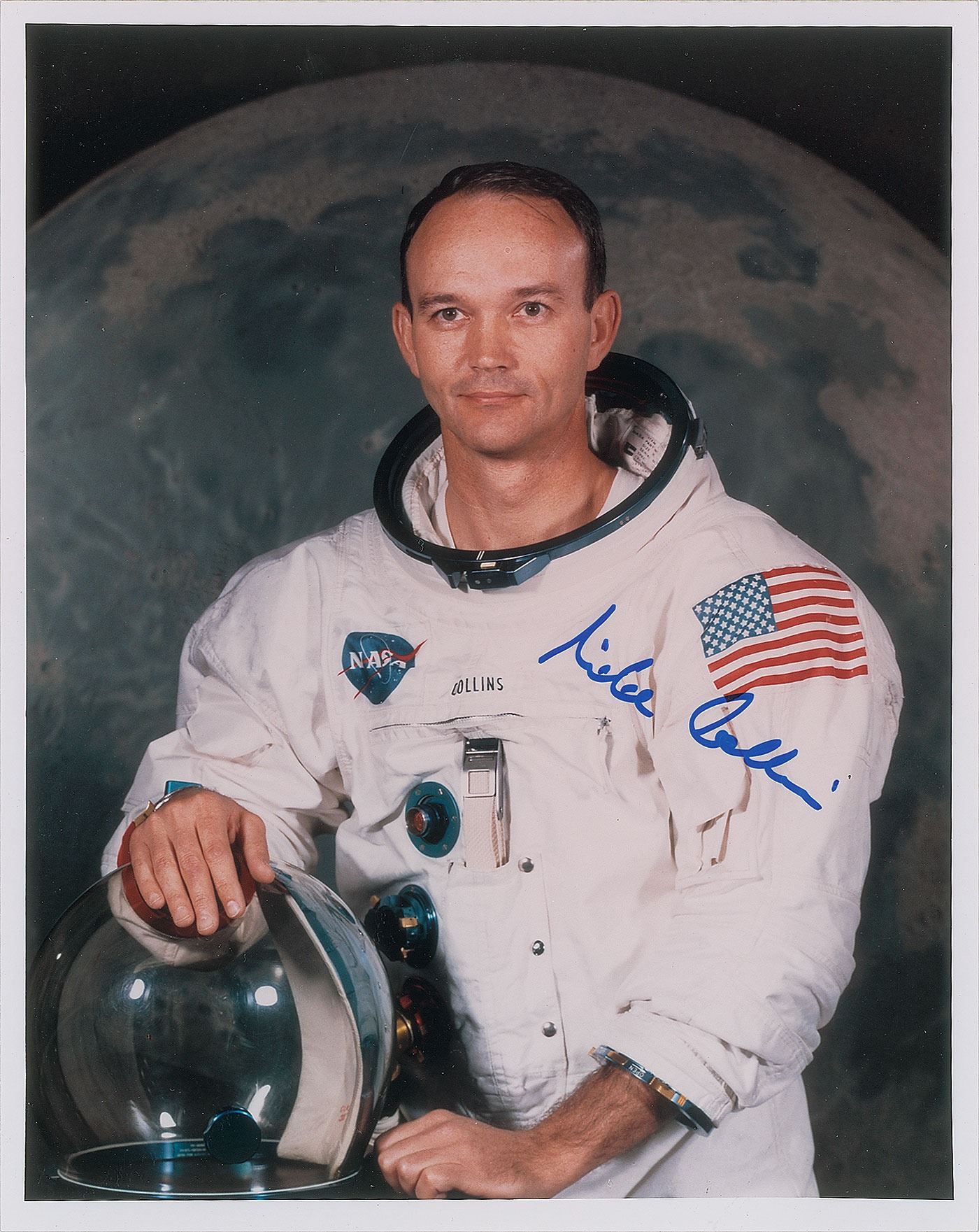 Color semi-glossy 8 x 10 photo of Collins posing in his white space suit against a lunar backdrop, signed in blue felt tip, "Mike Collins." In very fine condition.