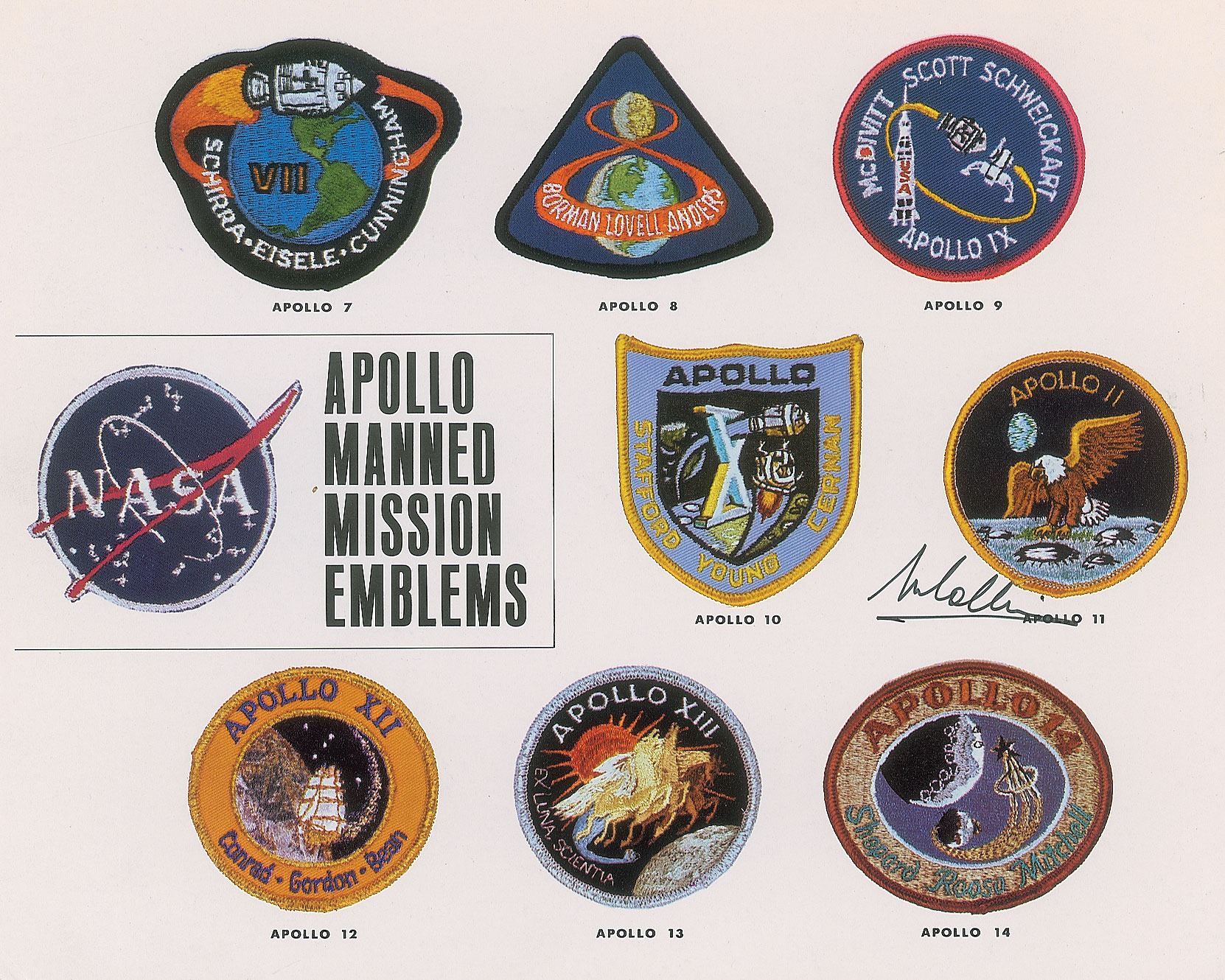 Official color 10 x 8 NASA lithograph of the Apollo manned mission patches, signed in black felt tip, "M. Collins." In fine condition.