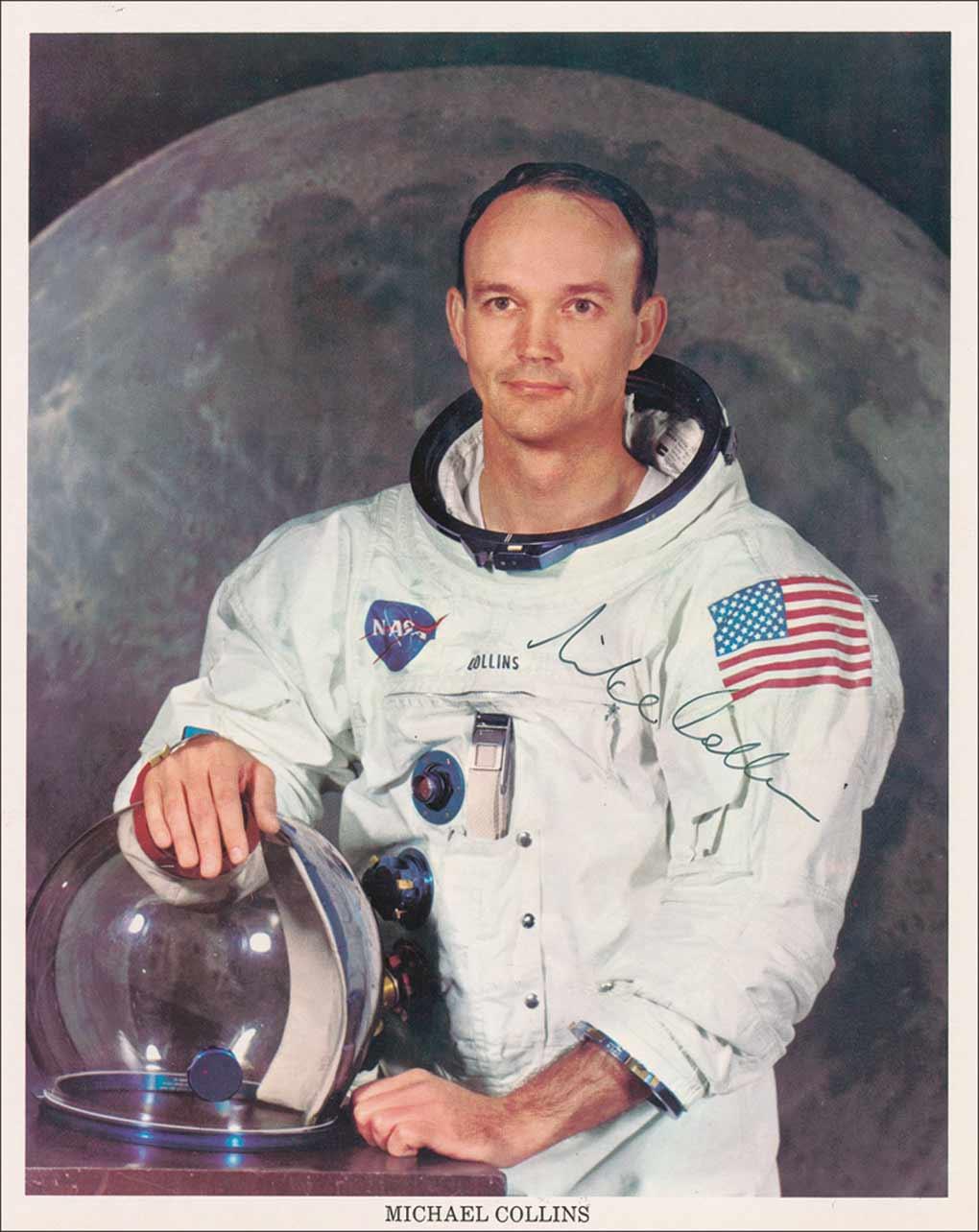 Color 8 x 10 NASA photo of Collins posing in his white flight suit against a lunar background, signed in black felt tip, “Mike Collins.” In fine condition, with minor creasing to two corners.
