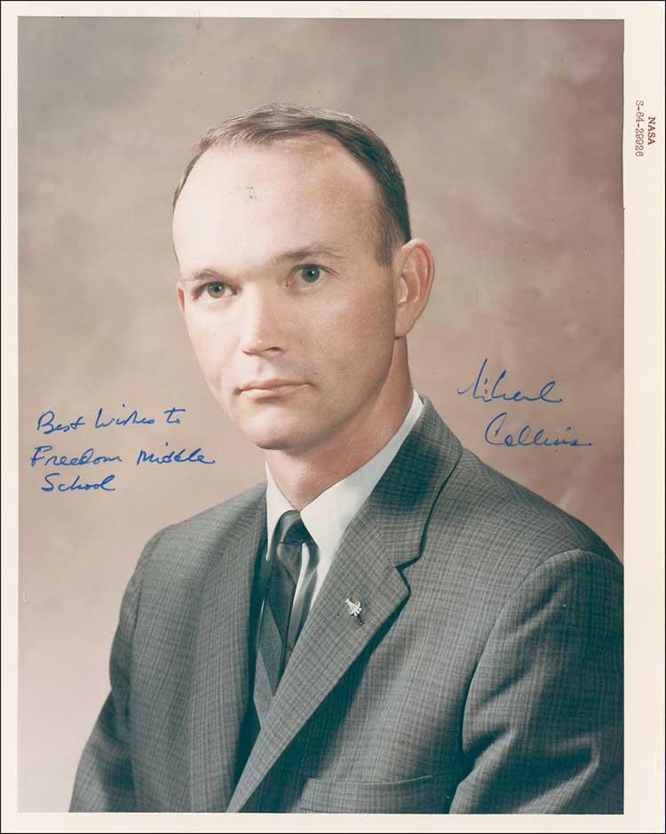Vintage color glossy 8 x 10 red serial-numbered NASA photo, signed and inscribed in blue ink “Best wishes to Freedom Middle School, Michael Collins.” In fine condition, with crease to facial area, light creasing to right edge, and small adhesive remnant to lower right. Pre-certified Scott Cornish and RRAuction COA.
