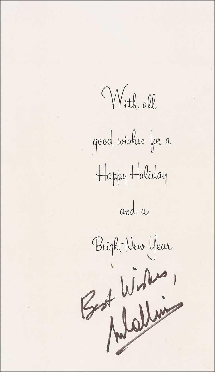 Christmas card, measuring 3.75 x 8 closed, with a color winter scene on the front, signed inside in black felt tip, “Best wishes, Michael Collins,” under a pre-printed sentiment. In fine condition. Pre-certified Scott Cornish and RRAuction COA.