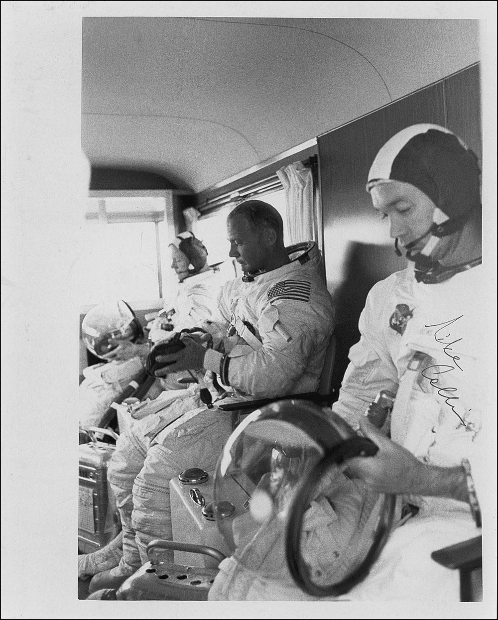 Glossy 8 x 10 NASA photo of the Apollo 11 crew members looking pensive in their van ride to the launch pad before their mission, signed in black ink by Collins. In fine condition, with some scattered light creases and surface marks. Pre-certified Scott Cornish and RRAuction COA.